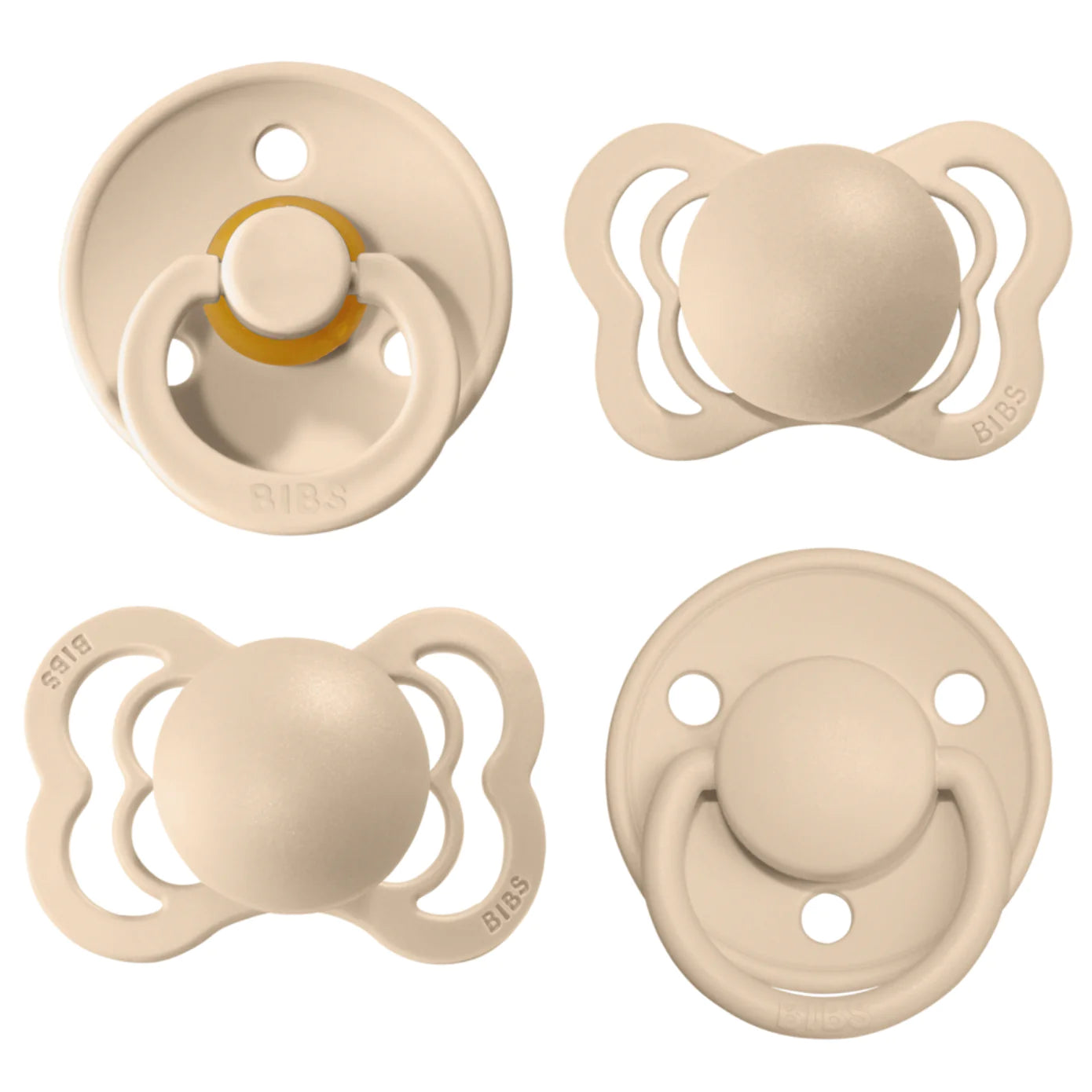 It's important to try out different shapes and sizes to find the perfect fit for your baby. In this collection, you get a pacifier from our 4 different categories with a selection of all of BIBS nipple types (round, symmetrical and anatomical) and materials (natural rubber latex and silicone).